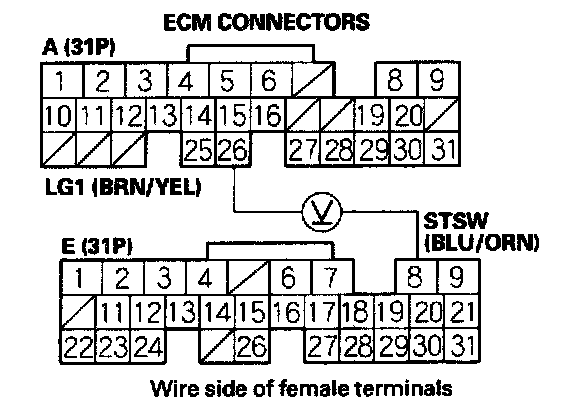 2. Measure voltage between ECM connector terminals A26 and E8 with the ignition switch in the start position (III).