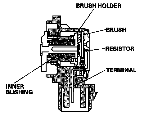 The TP sensor is a potentiometer connected to the throttle valve shaft. As the throttle position changes, the sensor varies the signal voltage to the ECM/PCM. The TP sensor is not replaceable apart from the throttle body.