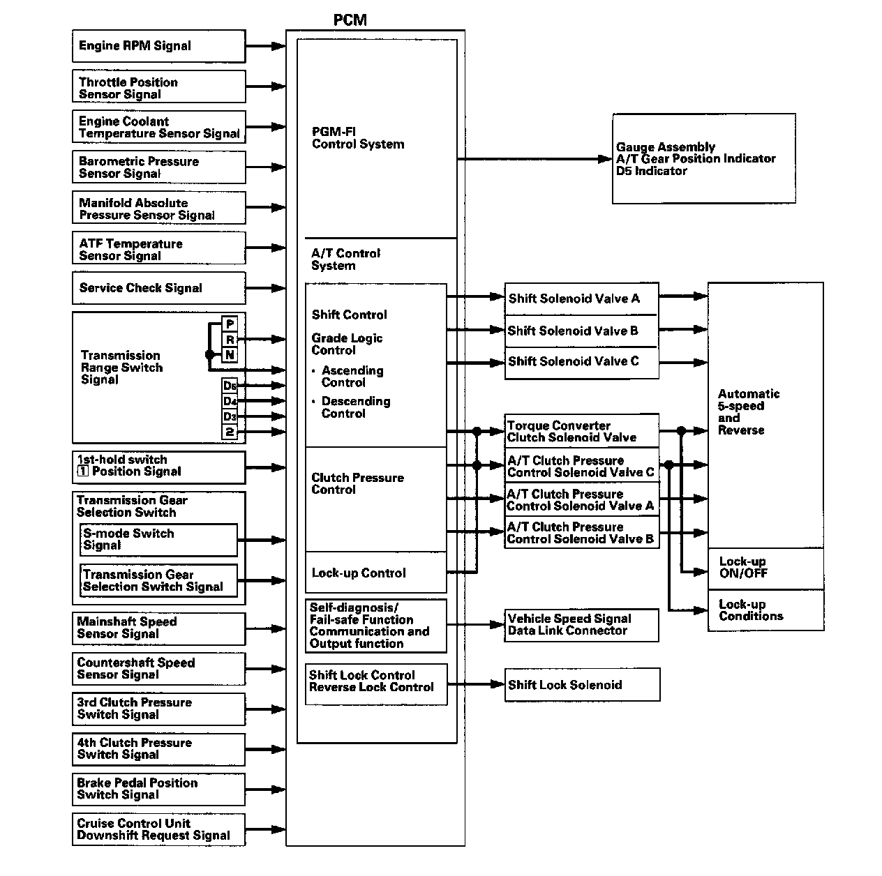 The PCM receives input signals from the sensors, switches, and other control units, perform processing data, and outputs signals for the engine control system and A/T control system. The A/T control system includes shift control, grade logic control, clutch pressure control, and lock-up control is stored in the PCM. The PCM switches the shift solenoid valves and the A/T clutch pressure control solenoid valves to control shifting transmission gears and lock-up torque converter clutch.