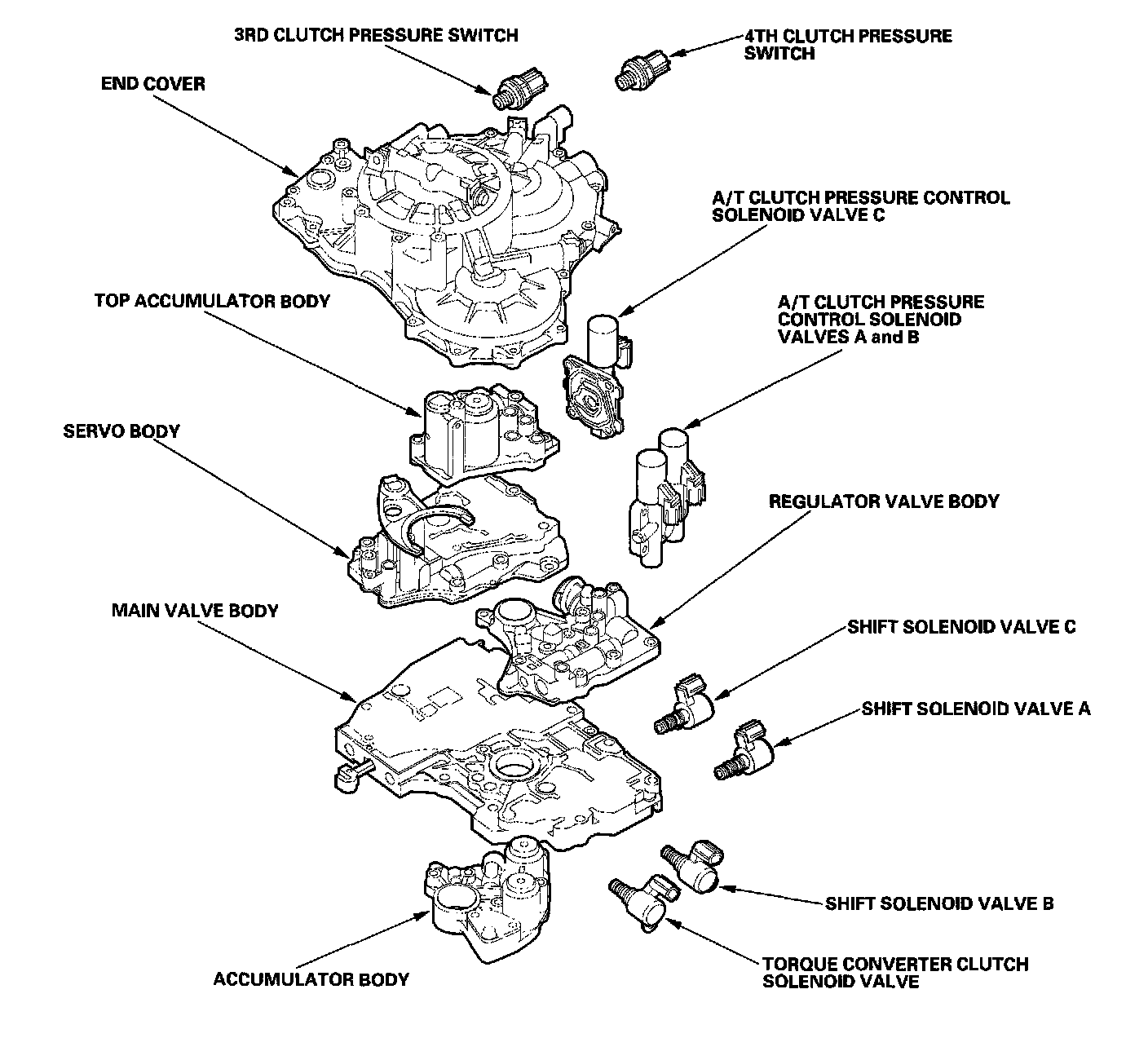 Hydraulic ControlsThe valve body includes the main valve body, the regulator valve body, the servo body, the top accumulator body, and the accumulator body. The ATF pump is driven by splines on the left end of the torque converter which is attached to the engine. Fluid flows through the regulator valve to maintain specified pressure through the main valve body to the manual valve, directing pressure to each of the clutches. The shift solenoid valve assemblies B and C are mounted on the outside of the torque converter housing. The shift solenoid valve A and the torque converter clutch solenoid valve are mounted on the torque converter housing. The A/T clutch pressure control solenoid valves A, B and C are mounted on the transmission housing.
