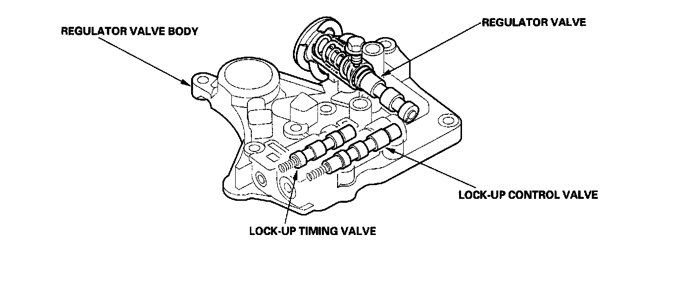 The regulator valve body is located on the main valve body. The regulator valve body contains the regulator valve, the lock-up timing valve, and the lock-up control valve.
