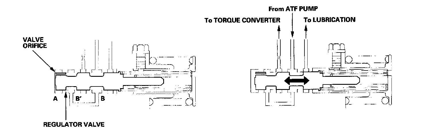 The regulator valve maintains constant hydraulic pressure from the ATF pump to the hydraulic control system, while also furnishing fluid to the lubricating system and torque converter. Fluid from the ATF pump flows through B and B'. Fluid entering from B flows through the valve orifice to the A cavity. This pressure of the A cavity pushes the regulator valve to the right side, and this movement of the regulator valve uncovers the fluid port to the torque converter and the relief valve. The fluid flows out to the torque converter and the relief valve, and the regulator valve moves to the left side. According to the level of the hydraulic pressure through B. the position of the regulator valve changes, and the amount of fluid from B' through the torque converter changes. This operation is continued, maintaining the line pressure.