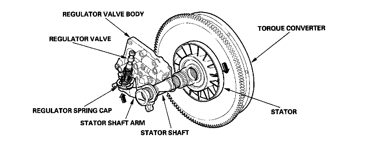 Increases in hydraulic pressure according to torque are performed by the regulator valve using stator torque reaction. The stator shaft is splined to the stator in the torque converter, and its arm end contacts the regulator spring cap. When the vehicle is accelerating or climbing (torque converter range), stator torque reaction acts on the stator shaft, and the stator arm pushes the regulator spring cap in the direction of the arrow in proportion to the reaction. The stator reaction spring compresses, and the regulator valve moves to increase the line pressure which is regulated by the regulator valve. The line pressure reaches its maximum when the stator torque reaction reaches its maximum.