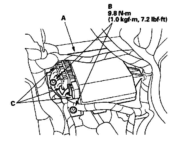 1. Install the new SRS unit (A) with Torx bolts (B), then connect the connectors (C) to the SRS unit, and push them into place until they click.