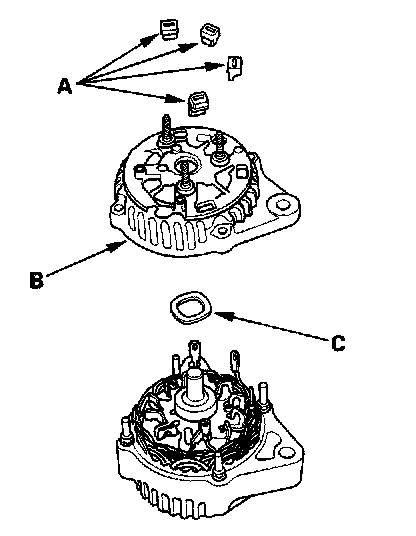 4. Remove the three flange nuts (A) and the screw (B) from the alternator, then remove the plate terminal (C).
