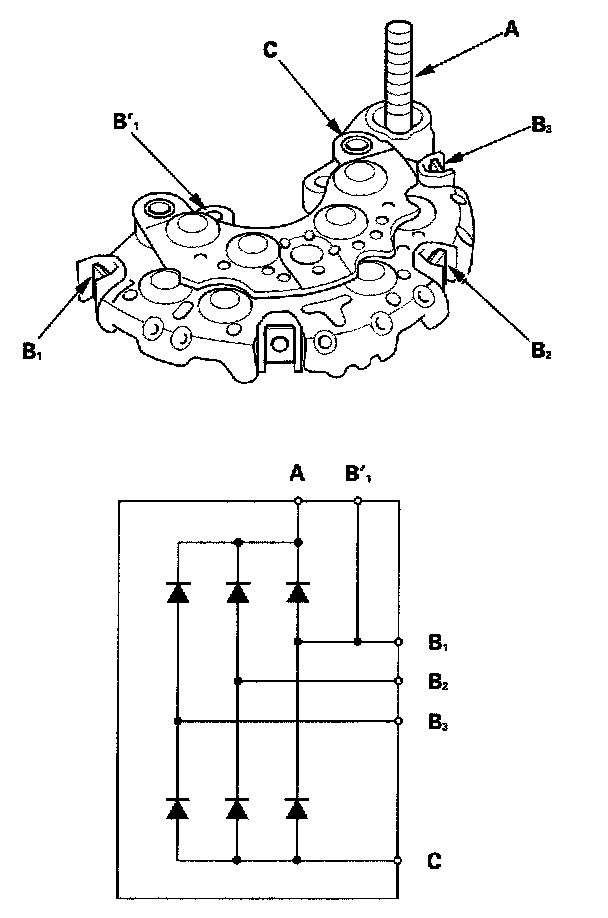 18. Check for continuity in each direction, between the B terminal (A) and P terminals (B), and between the E terminal (C) and P terminals of each diode pair. All diodes should have continuity in only one direction. Because the rectifier diodes are designed to allow current to pass in one direction, and the rectifier is made up of six diodes (three pairs), you mustiest each diode in both directions for continuity with an ohmmeter that has diode checking capability: a total of 12 checks.
