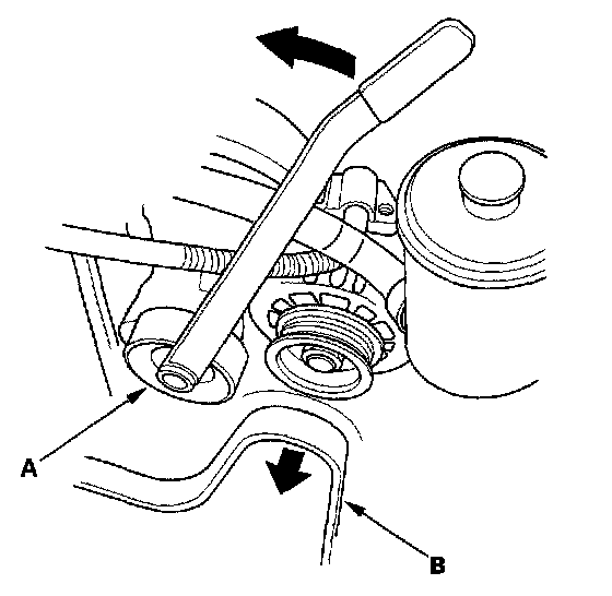 3. Move the auto-tensioner (A) to relieve tension from the alternator belt (B), and remove the alternator belt.