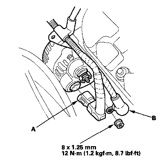 4. Disconnect the alternator 4P connector (A) and BLK wire (B) from the alternator.