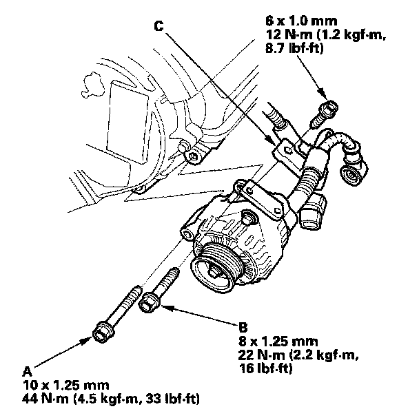 5. Remove the mount bolt (A) and alternator bracket mounting bolt (B), then remove the harness clamp (C) from the alternator bracket.