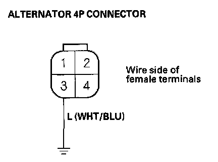 1. Check that the alternator B terminal, and 4P connector and under-hood fuse/relay box terminals are securely tightened and free of corrosion.