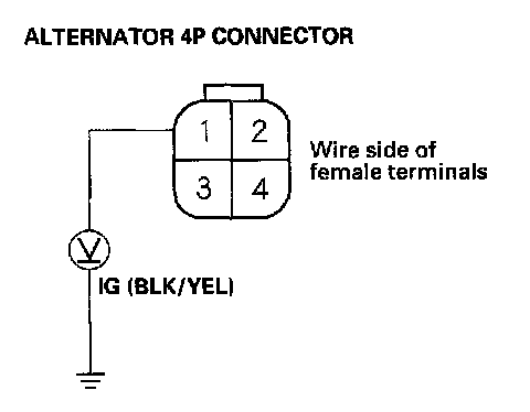 10. Measure the voltage at the No. 1 terminal of the alternator 4P connector with the ignition switch ON (II).