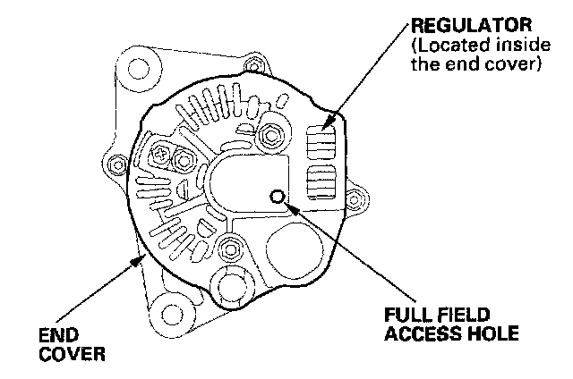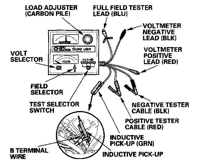 11. With the engine speed still at 2,000 rpm, full-field the alternator. Attach the probe to the VAT-40 full-field test lead, and insert the probe into the full field access hole at the back of the alternator. Switch the field selector to the "A (Ground)" position momentarily, and check the amperage reading. Because voltage will rise quickly when the alternator is full-fielded, do not allow the voltage to exceed 18 V: it may damage the electrical system.