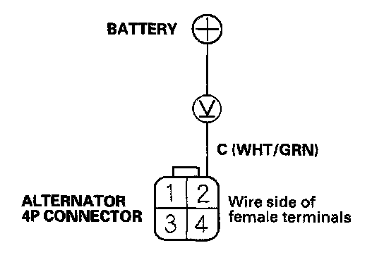 4. Measure voltage between the alternator 4P connector terminal No. 2 and the positive terminal of the battery.