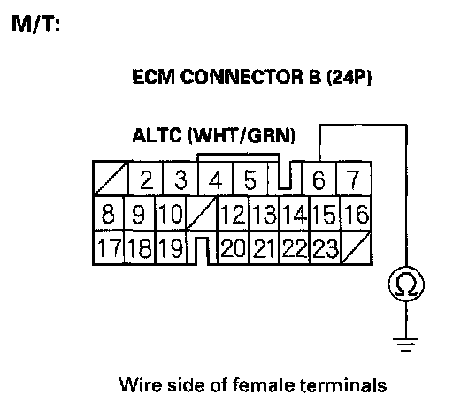 7. Check for continuity between ECM connector terminal B6 (M/T) or PCM connector terminal C2 (A/T) and body ground.