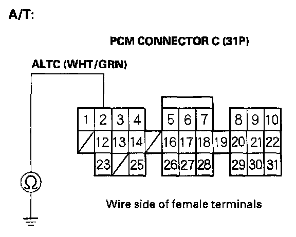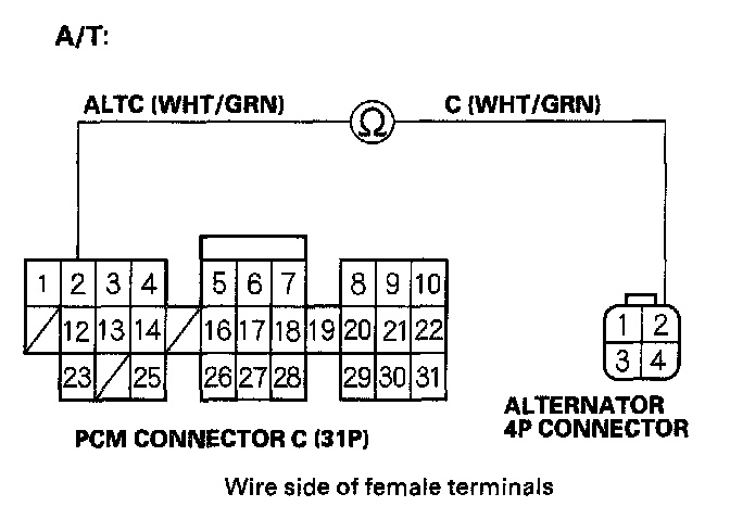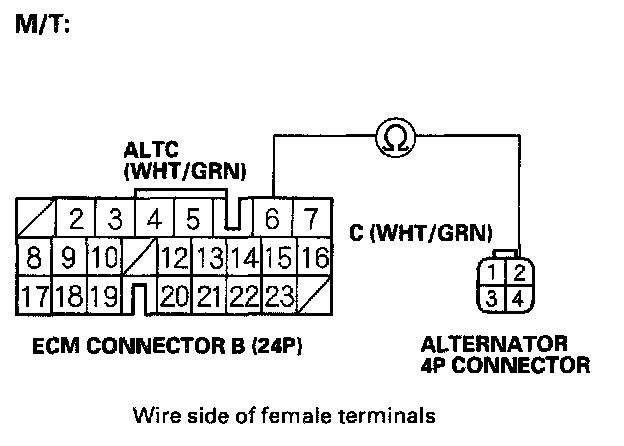 10. Check for continuity between ECM connector terminal B6 (M/T) or PCM connector terminal C2 (A/T) and alternator 4P connector terminal No. 2.