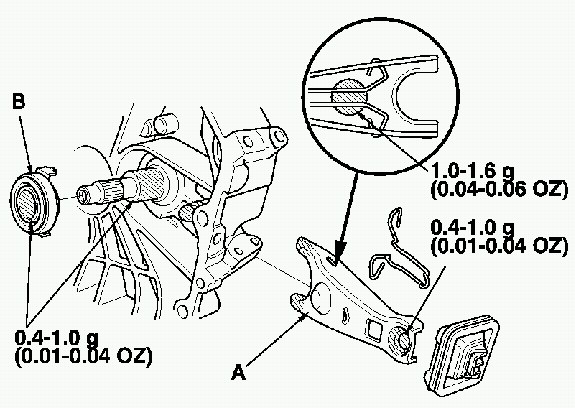2. Apply Super High Temp Urea Grease (P/N 08798-9002) on the release fork (A) and the release bearing (B) in the shaded areas. Install the release fork and release bearing.