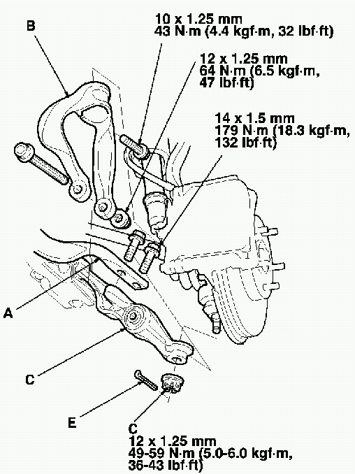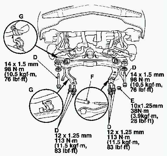 9. Install the transmission lower mount nuts (E) and tighten them tot he specified torque.