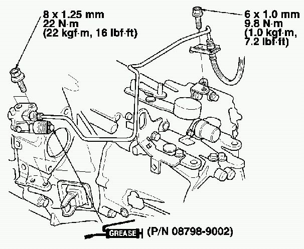 19. Apply Super High Temp Urea Grease (P/N 08798-9002) to the end of the slave cylinder rod. Install the slave cylinder. Be careful not to bend the clutch line.