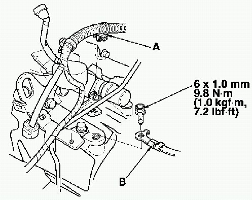 7. Remove the special tool, then install the transmission side mount (A) to the transmission, then loosely tighten the three bolts (B).