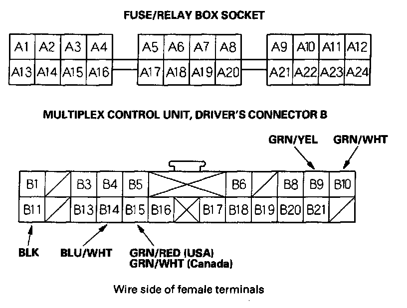 4. With the driver's multiplex control unit still disconnected, make these input tests at the connector and driver's under-dash fuse/relay box sockets.