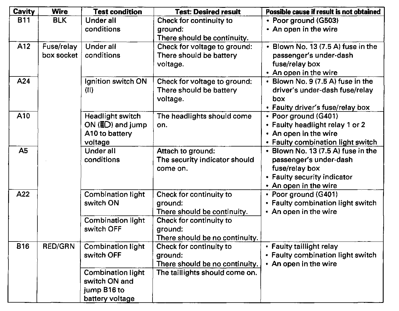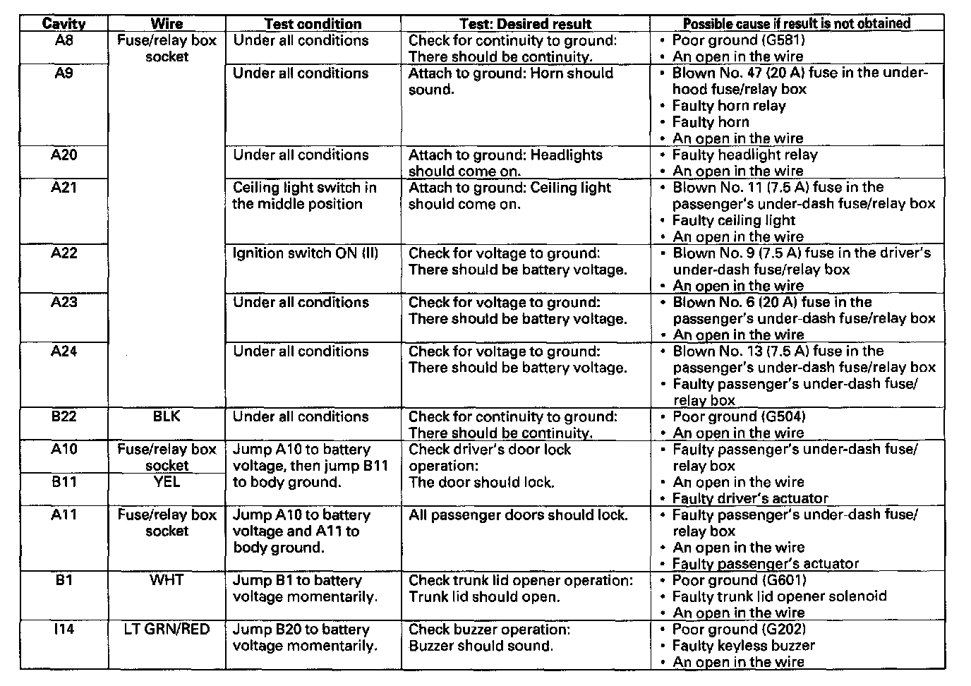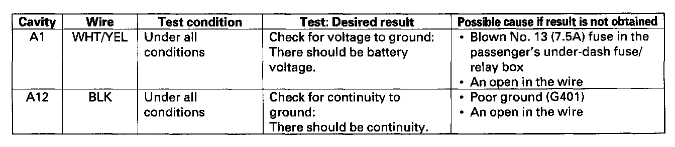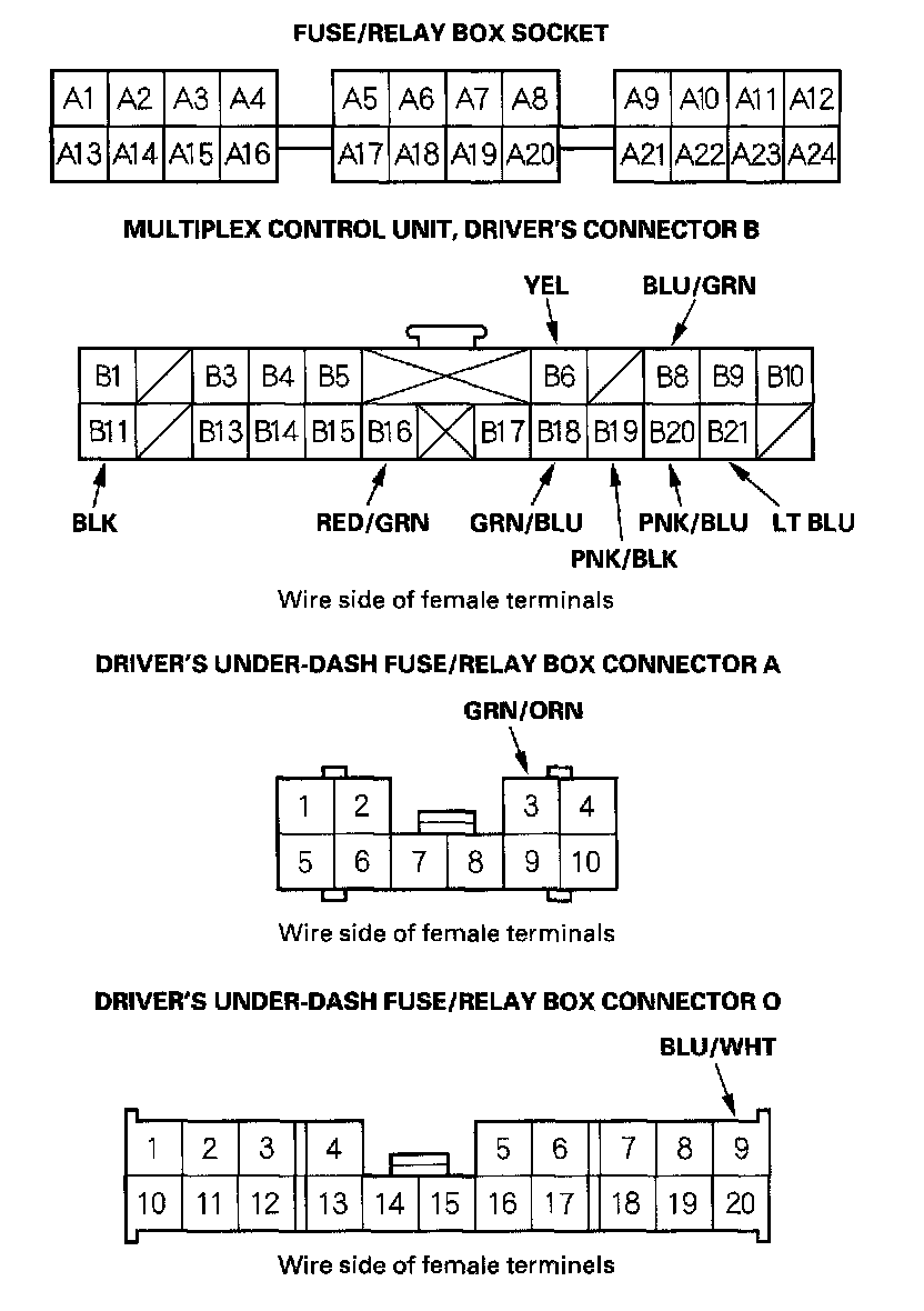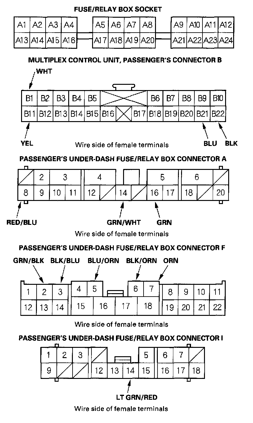 8. With the passenger's multiplex control unit still disconnected, make these input tests at the connectors and the passenger's under dash fuse/relay box sockets