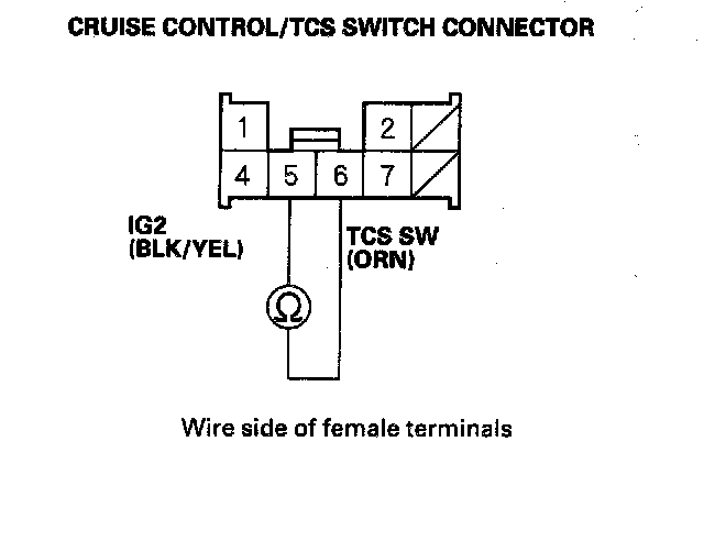 2. Check for continuity between terminal No. 5 and No. 6. There should be continuity when the TCS switch is pushed.