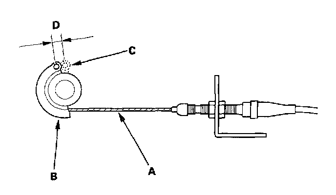3. Measure the amount of movement of the output linkage (B) until the engine speed starts to increase. At first, the output linkage should be located at the fully closed position (C). The free play (D) should be 3.75 ± 0.5 mm (0.15 ± 0.02 in.).