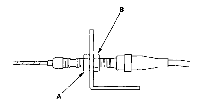 6. Pull the cable so that the adjusting nut (A) touches the bracket, then tighten the locknut (B).
