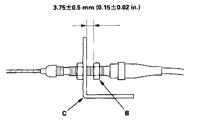5. Turn the adjusting nut (A) until it is 3.75 ± 0.5 mm (0.15 ± 0.02 in.) away from the bracket (B).
