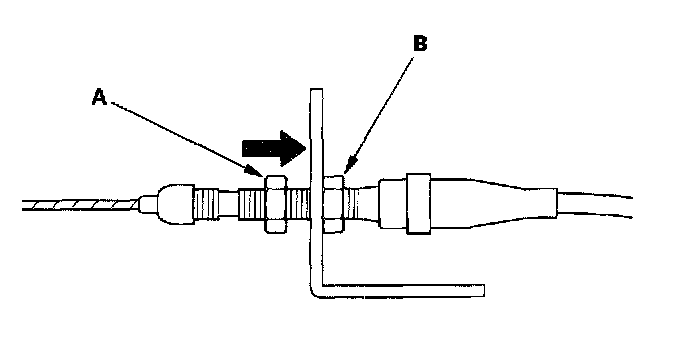 4. If the free play is not within specs, move the cable to the point where the engine speed starts to increase, then tighten the locknut (A) and adjusting nut(B).
