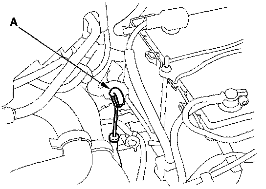 3. Remove the dipstick (yellow loop) (A) from the transmission, and wipe it with a clean cloth.