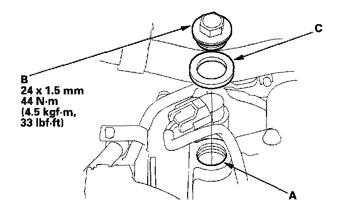 7. Install the ATF filler bolt (B) with a new sealing washer (C).