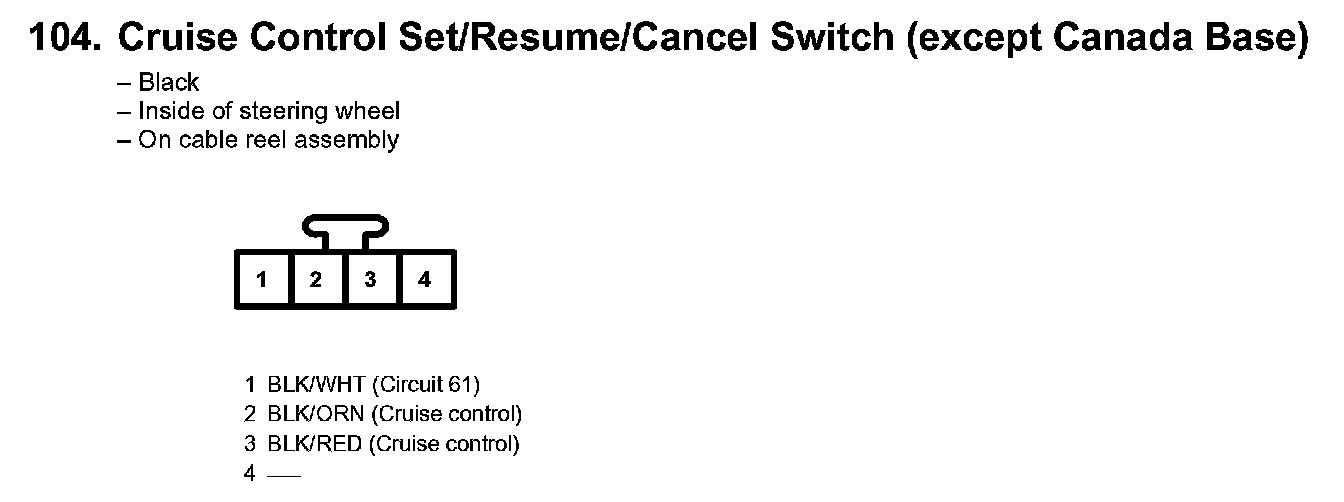 104. Cruise Control Set/Resume/Cancel Switch (except Canada Base):