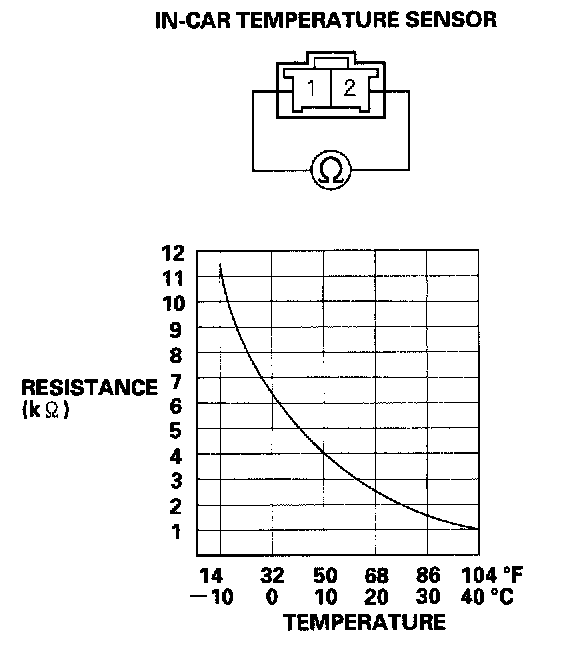 Compare the resistance reading between the No.1 and No.2 terminals of the in-car temperature sensor with the specifications shown in the graph; the resistance should be within the specifications.