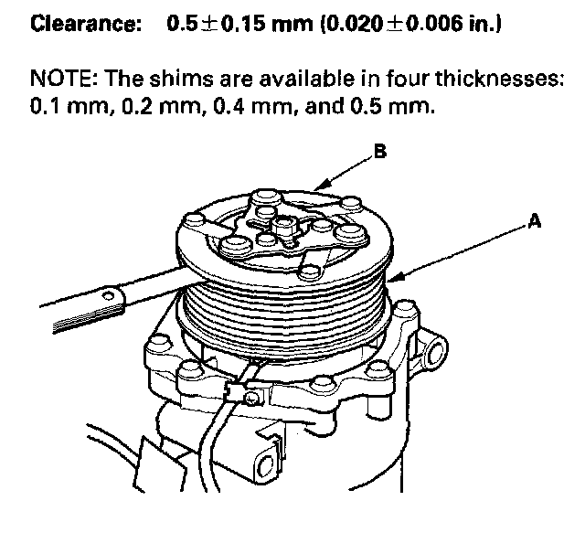 3. Measure the clearance between the rotor pulley (A) and the armature plate (~) all the way around. If the clearance is not within specified limits, remove the armature plate and add or remove shims as needed to increase or decrease clearance.