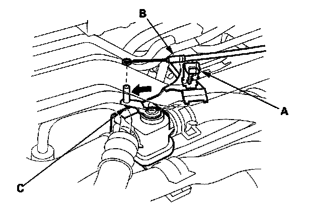 4. From under the hood, open the cable clamp (A), then disconnect the heater valve cable (B) from the heater valve arm (C). Turn the heater valve arm to the fully opened position as shown.