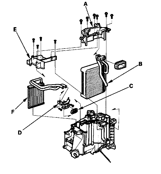 12. Remove the self-tapping screws and the expansion valve cover (A). Carefully pull out the evaporator core (B) so you don't bend the inlet and outlet pipes. Remove the grommet (C), then remove the self-tapping screws and the flange cover (D). Remove the self-tapping screws and the pipe cover (E), then carefully pull out the heater core (F) so you don't bend the inlet and outlet pipes.