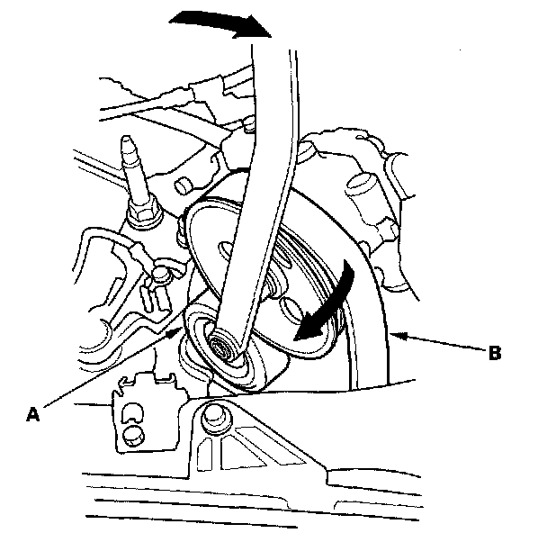 2. Move the auto-tensioner (A) to relieve tension from the drive belt (B), and remove the drive belt.