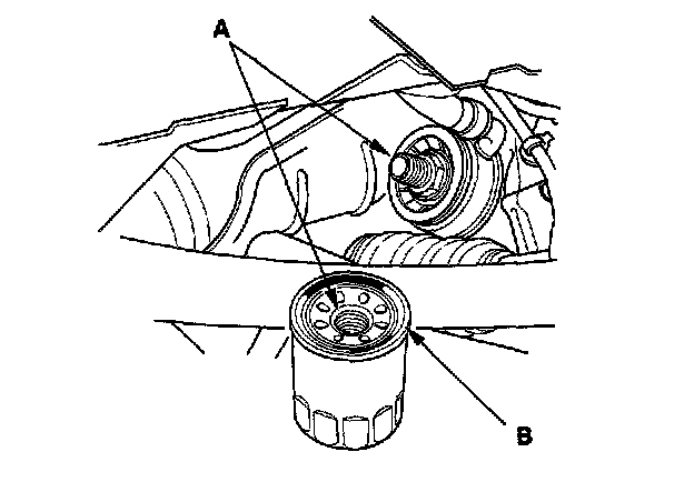 2. Inspect the threads (A) and rubber seal (B) on the new filter. Wipe off the seat on the engine block, then apply a light coat of oil to the filter rubber seal. Use only filters with a built-in bypass system.