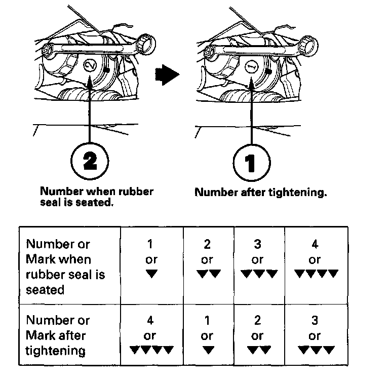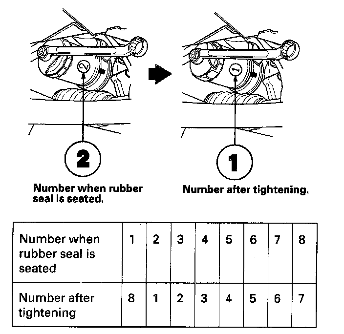 ^ Tighten the filter by turning it clockwise 7 numbers from the one you noted. For example, if number 2 is at the bottom when the seal is seated, tighten the filter until the number 1 comes around the bottom.