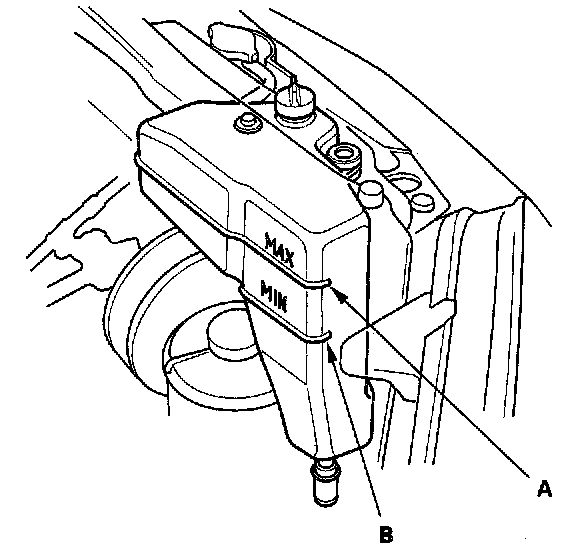 1. Look at the coolant level in the reserve tank. Make sure it is between the MAX mark (A) and WIN mark (B).