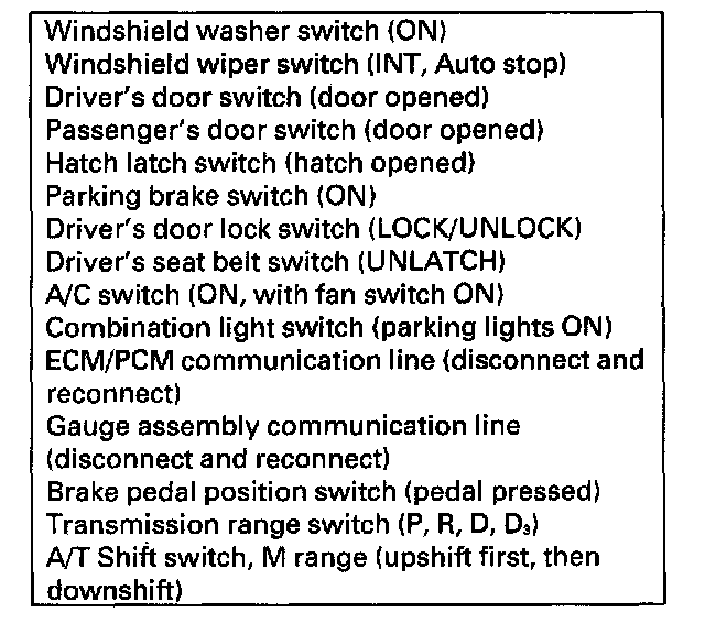 10. Look in the following table for the switches most closely related to the problem. While still in Mode 2, operate the switches. If the circuit is OK, the ceiling light should blink once. If the circuit is faulty, there will be no indication.