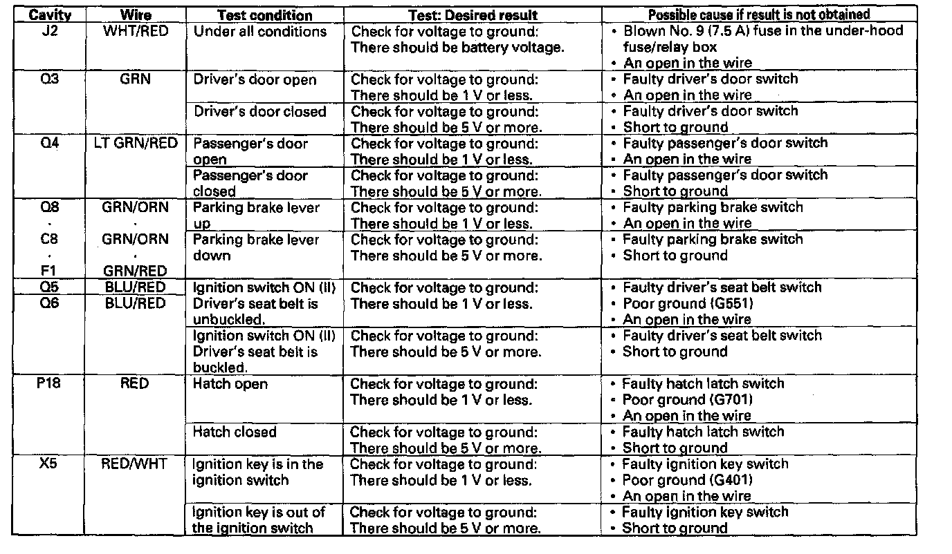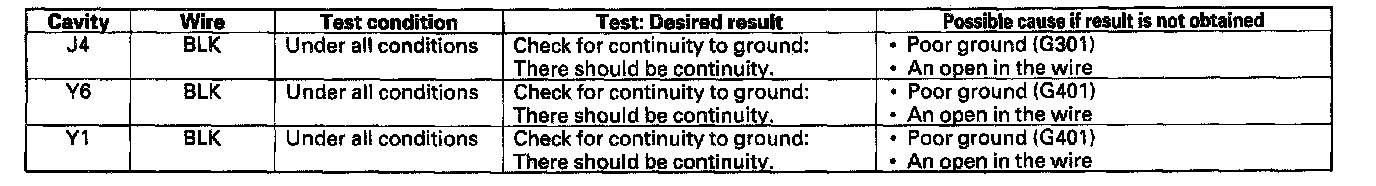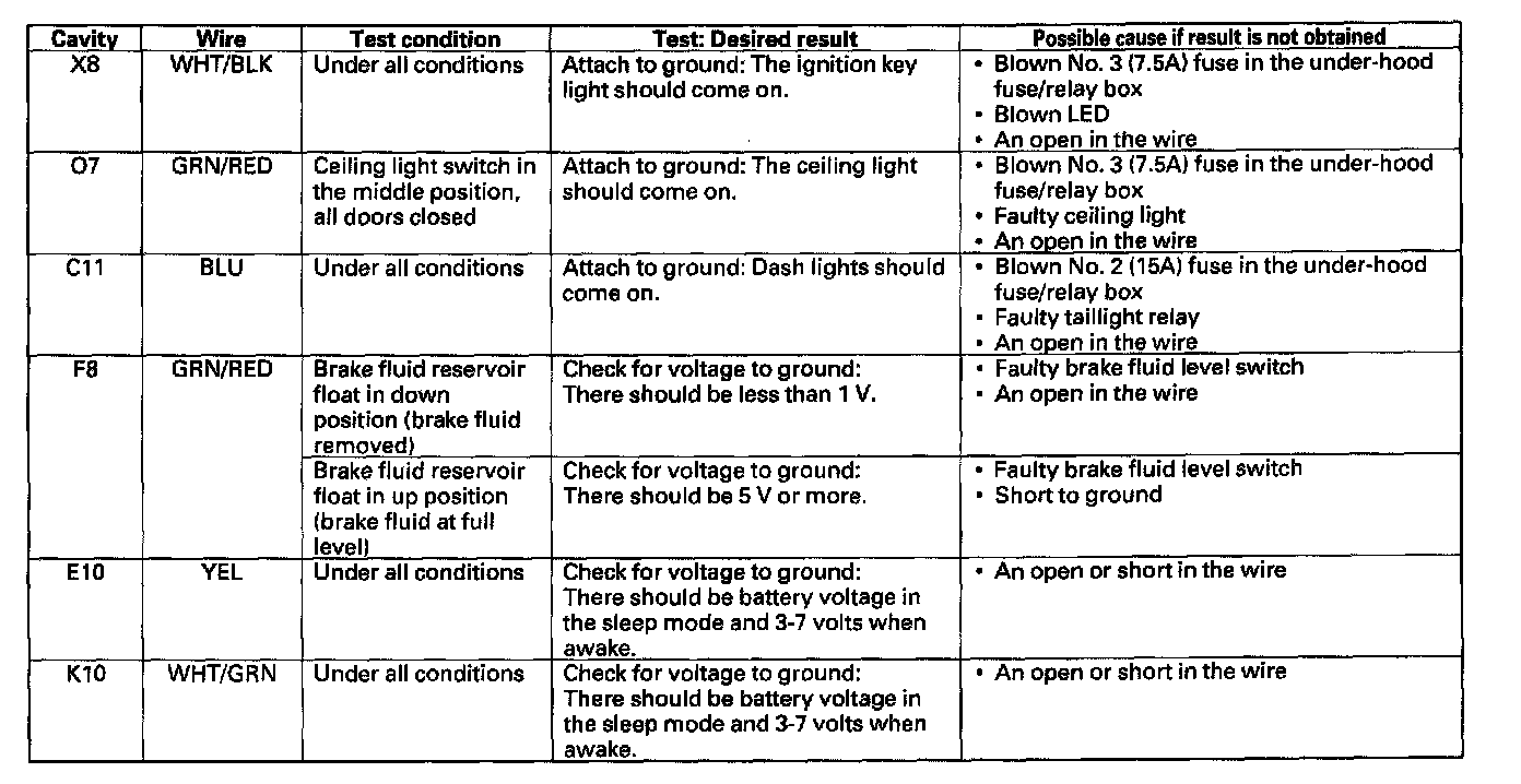 5. Reconnect the connectors to the under-dash fuse/relay box, and make sure these input tests at the appropriate connectors on the underdash fuse/relay box.