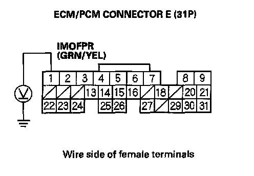 14. Turn the ignition switch ON (II), and measure voltage between ECM/PCM connector terminal E1 and body ground within the first 2 seconds after the ignition switch was turned on.