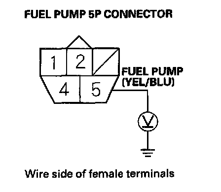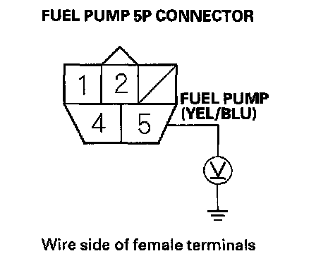 23. Measure voltage between fuel pump 5P connector terminal No.5 and body ground within the first 2 seconds after the ignition switch was turned on.