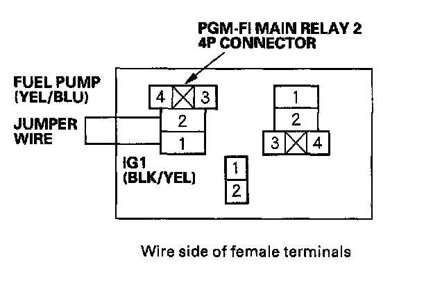 21. Connect the PGM-FI main relay 2 4P connector terminals No. 1 and No.2 with a jumper wire.
