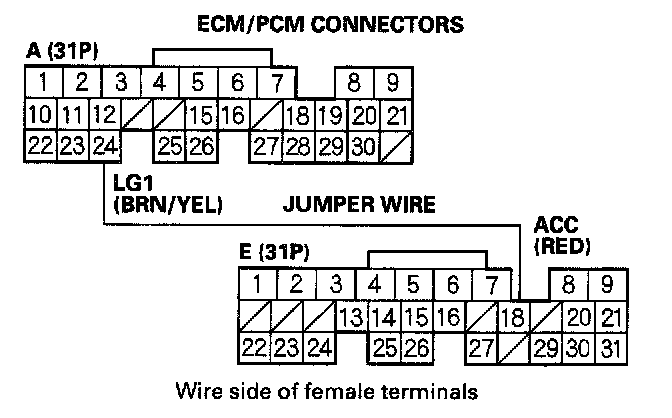 2. Momentarily connect ECM/PCM connector terminals A24 and E15 with a jumper wire several times.