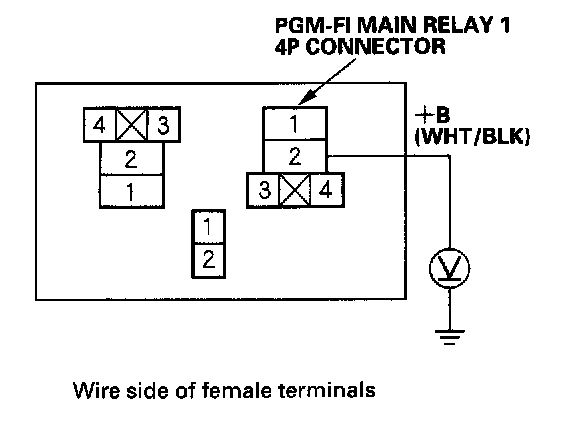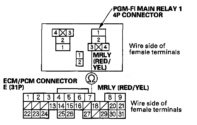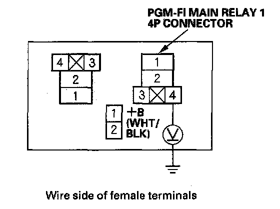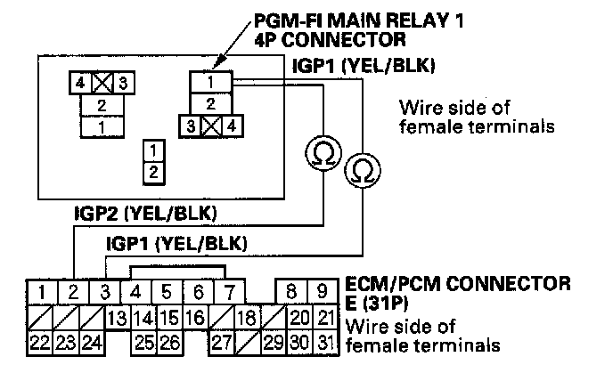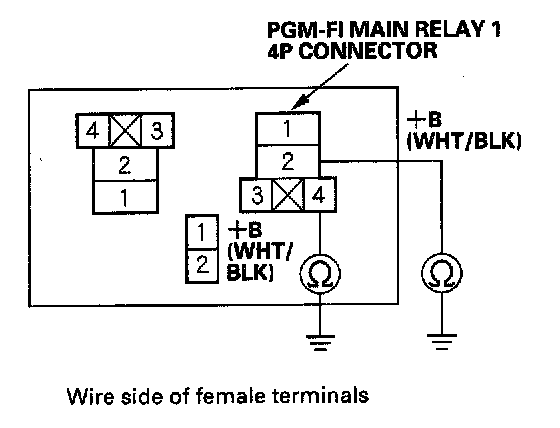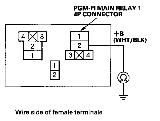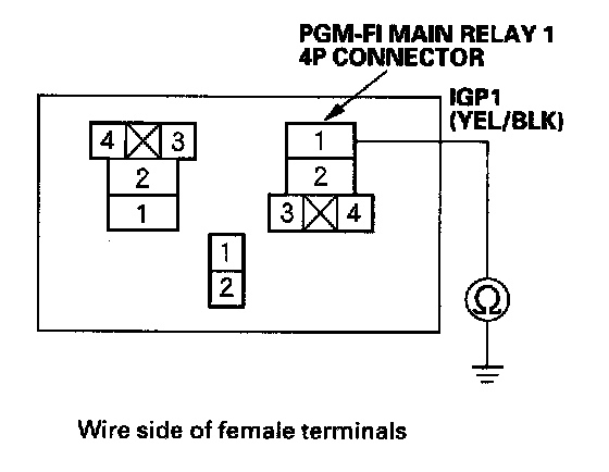 18. Check for continuity between body ground and the PGM-FI main relay 1 4P connector terminals No.2 and No.4 individually.