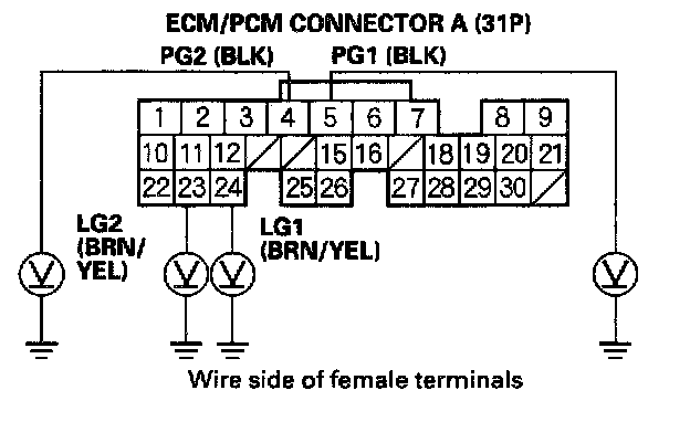 51. Measure voltage between body ground and ECM/PCM connector terminals A4, AS, A23, and A24 individually.