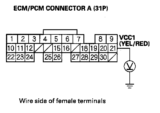 54. Disconnect the 3P connector from each of these sensors, one at a time, and measure voltage between body ground and ECM/PCM connector terminal A21 with the ignition switch ON (II).